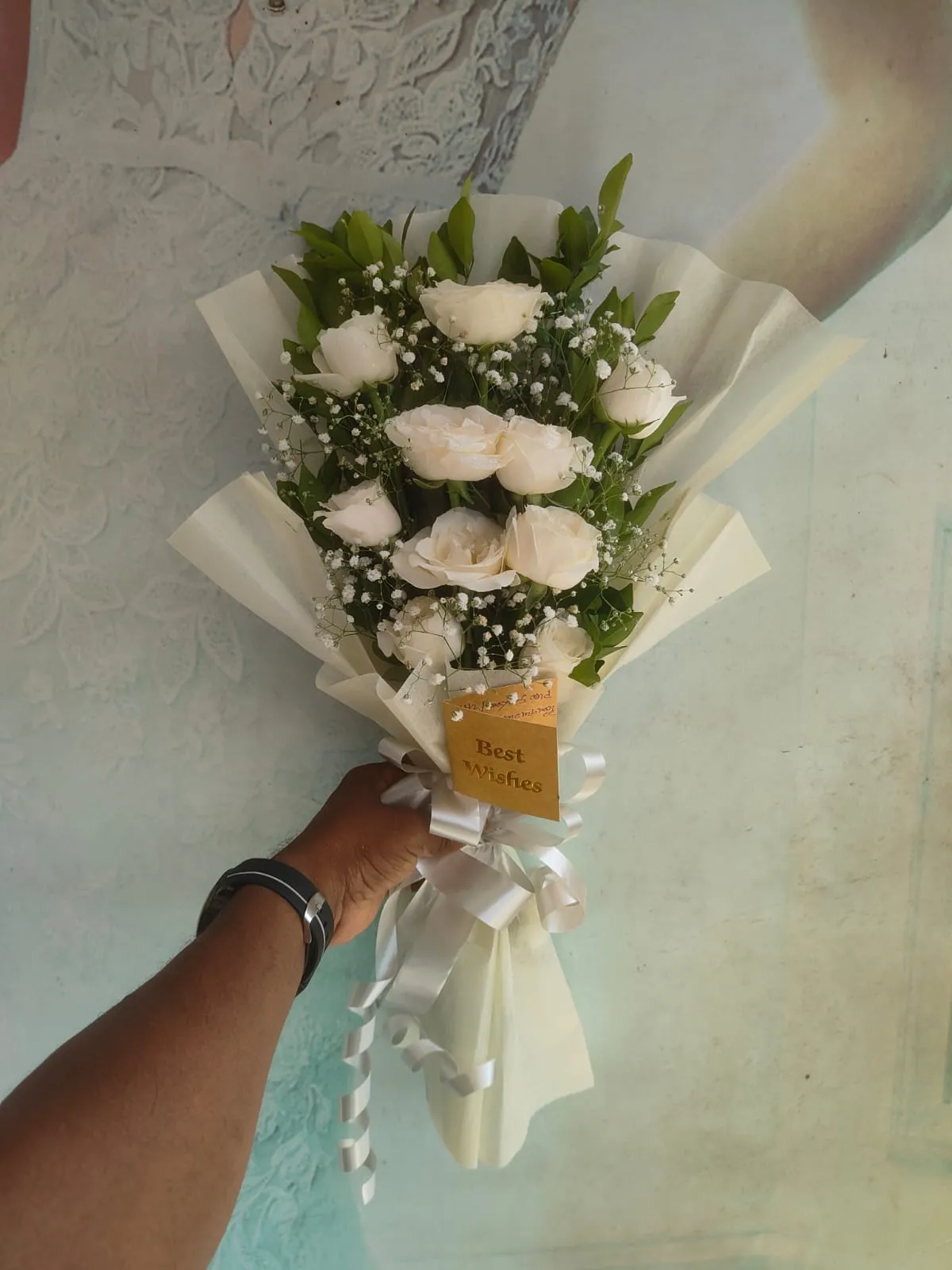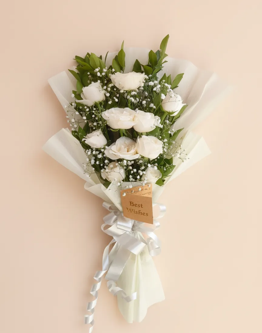 A graceful bunch of elegant white roses wrapped delicately—ideal for expressing purity, peace, and new beginnings.
