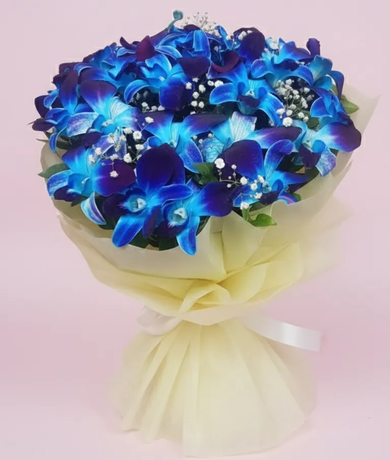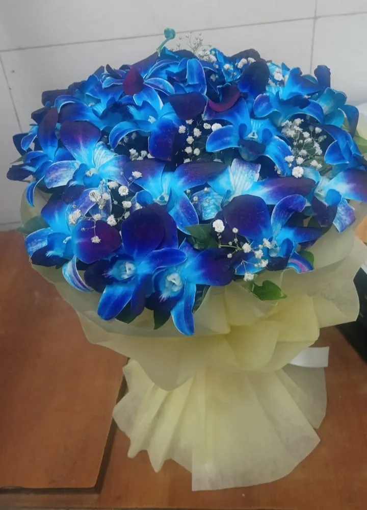 • Fresh blue orchids with elegant white fillers (4 – 5 orchid stick will be used)